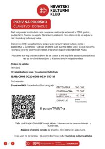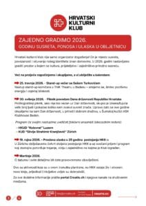 Hrvatski kulturni klub (HKK) pozvao je svoje članove i prijatelje na 23. godišnju skupštinu, koja će se održati 21. veljače 2026. u Schwerzenbachu. Skupština predstavlja središnji godišnji susret Kluba, ali i važan trenutak za okupljanje hrvatske zajednice u Švicarskoj.