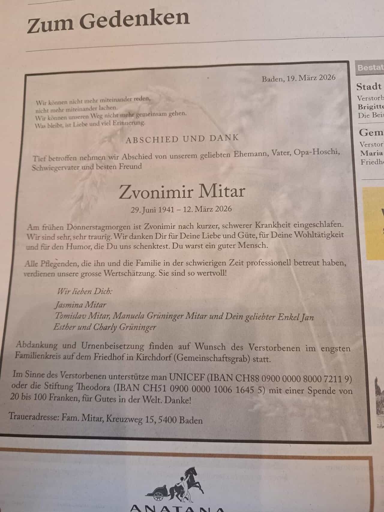 Adresa za izražavanje sućuti: Fam. Mitar, Kreuzweg 15, 5400 Baden